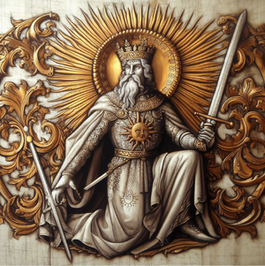 Der göttliche König und Vater wird auf Abbildungen häufig mit einem Schwert und der Sonne als Symbol dargestellt.